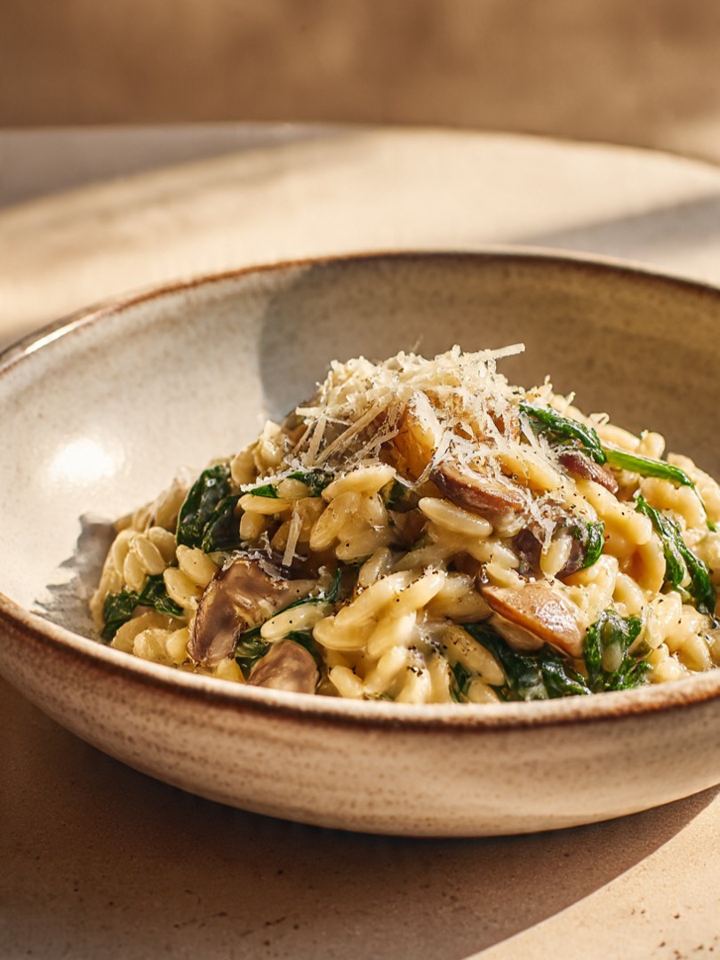 Romige orzo met kastanjechampignons, spinazie en kaas
