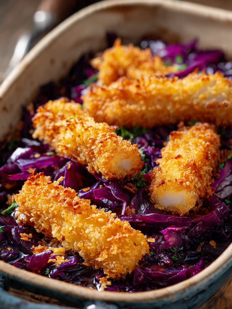 Rode kool ovenschotel met vissticksBeoordeling: 4,8/5 – Een verrassende combinatie van zachte, zoetzure rode kool en goudkrokante vissticks Dit gerecht brengt kleur, textuur en comfort perfect samen. De diepe paarse tinten van geroosterde rode kool vormen een rijke basis, terwijl bovenop goudbruine, knapperige vissticks liggen zoals te zien is op de foto. De combinatie is…