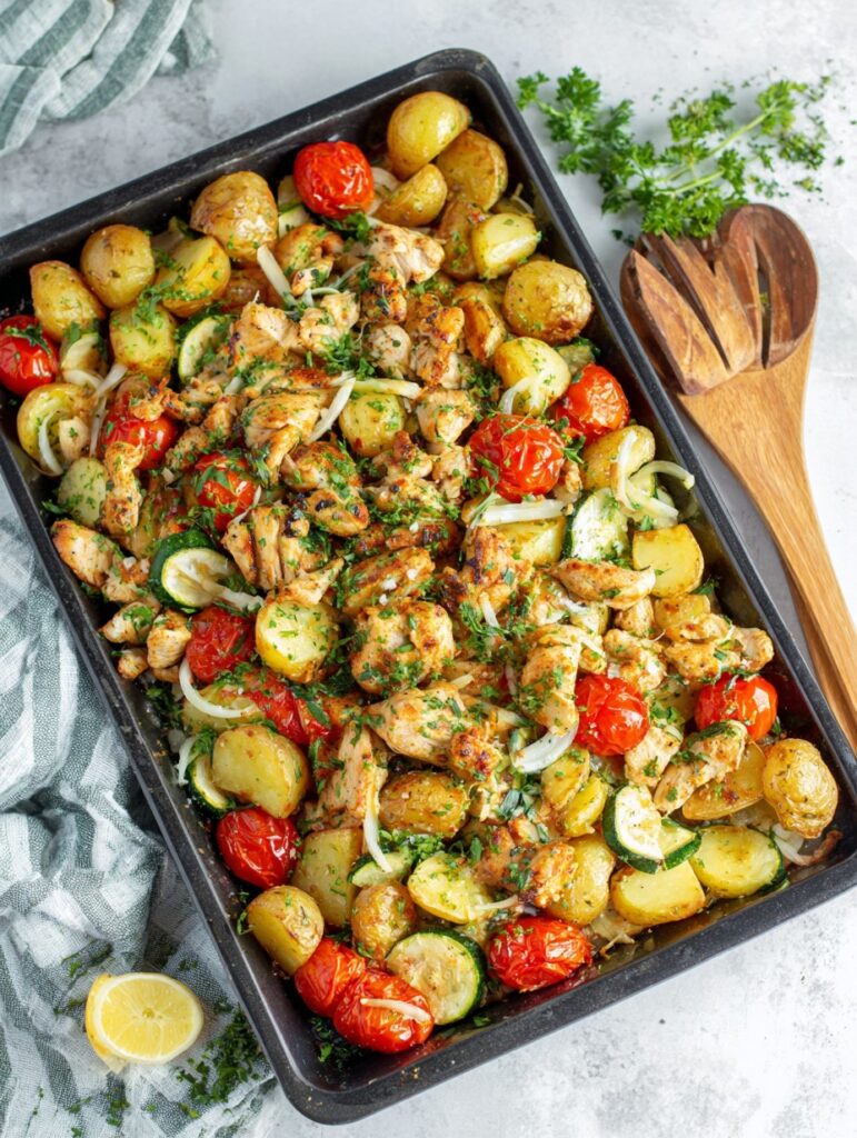 De traybake van aardappeltjes met kip en Parmezaan is een ultiem comfortgerecht: alles op één bakplaat, eenvoudig te bereiden en toch vol van smaak. Malse kipstukjes, goudbruine krieltjes, sappige tomaatjes en plakjes courgette worden samen geroosterd in de oven en vervolgens afgewerkt met een royale strooi Parmezaanse kaas. Het resultaat is een maaltijd die eruitziet als een feest, ruikt als een Italiaanse trattoria en smaakt als pure huiselijke warmte.