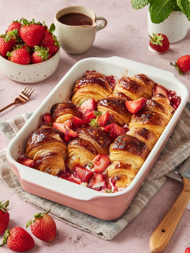 De combinatie van luchtige, boterige croissants, frisse aardbeien en zachte room maakt dit gerecht een absolute publieksfavoriet. Of je hem nu serveert bij het ontbijt, de brunch of als warm dessert met een bolletje vanille-ijs – dit is comfortfood op zijn elegantst.