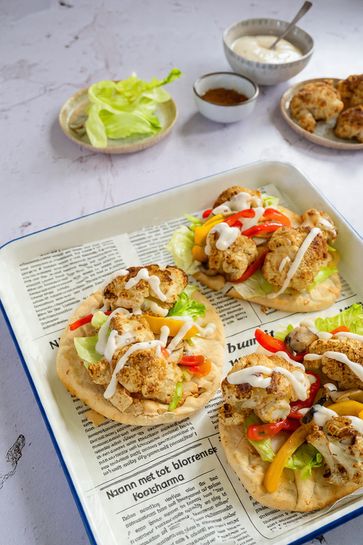 - Als bowl: Serveer de bloemkoolshoarma met bulgur of couscous in plaats van naan.