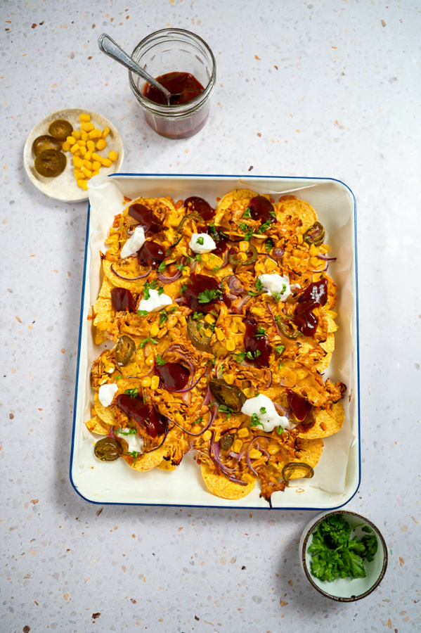 Haal de schaal uit de oven en werk direct af met toefjes zure room, verse koriander of peterselie, en eventueel nog wat extra barbecuesaus.