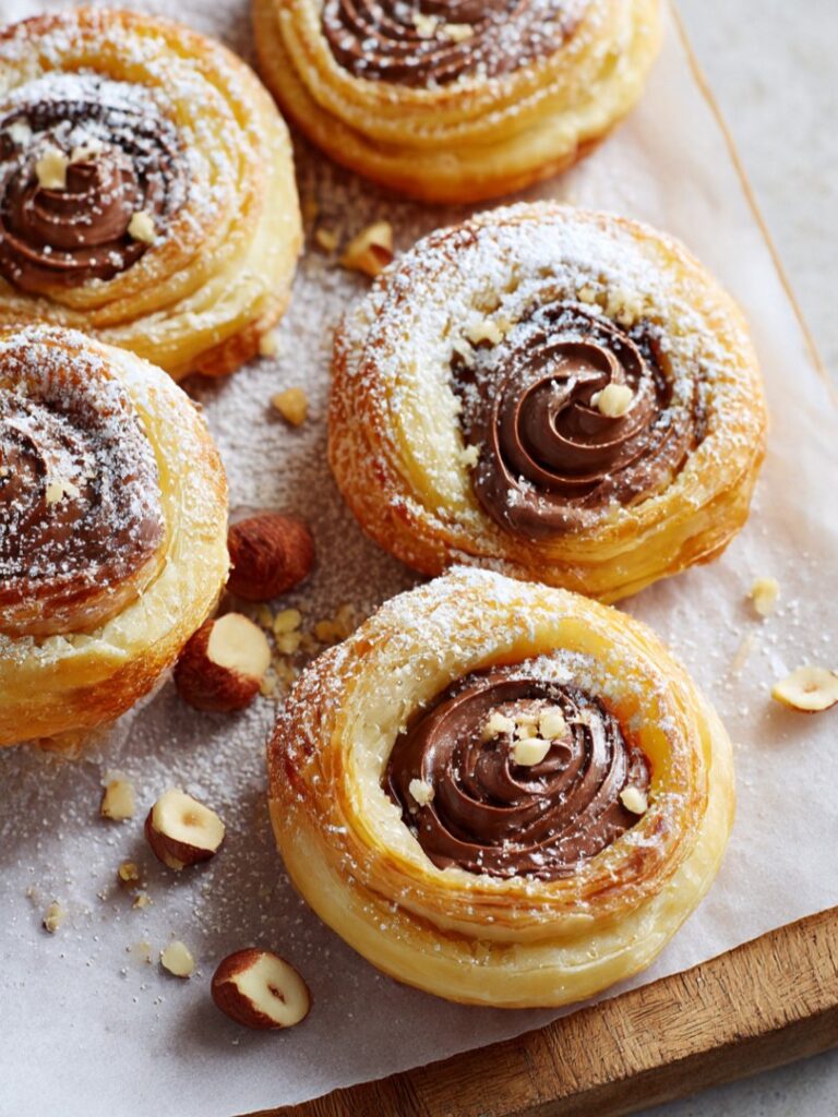 Bladerdeegnestjes met Nutella zijn de ultieme combinatie van gemak, elegantie en onweerstaanbare smaak. Deze kleine, luchtige bladerdeeggebakjes zijn gevuld met romige Nutella en worden na het bakken bestoven met een delicate laag poedersuiker. Ze zijn ideaal voor brunch, high tea, verjaardagen of wanneer u simpelweg trek hebt in iets feestelijks en zoets. De foto toont perfect goudbruine, knapperige ringen van bladerdeeg met een weelderige draai van chocolade-hazelnootpasta in het midden, afgewerkt met fijngehakte hazelnoten voor een lichte crunch.