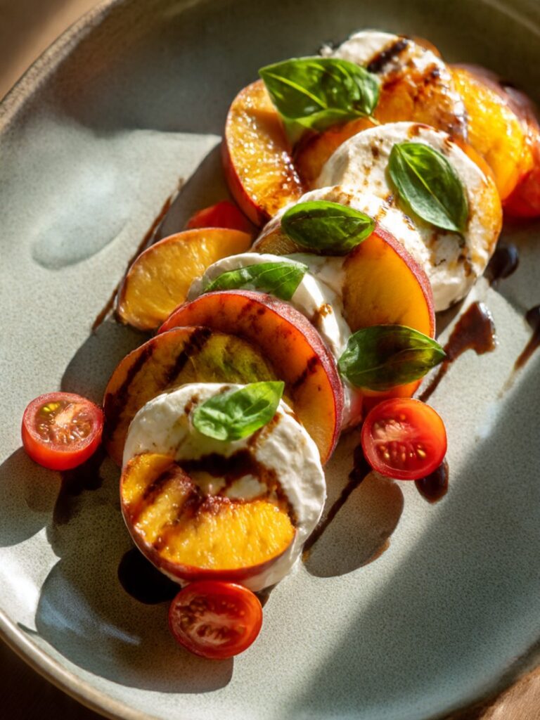 Deze caprese salade met gekarameliseerde perzik is een bijzondere variatie op de klassieke Italiaanse caprese en combineert zachte romige mozzarella, zoete warme perzik en frisse basilicum met een lichte karamellisatie. Het resultaat is een verfijnde, zomerse salade die zowel als voorgerecht, lichte lunch of onderdeel van een uitgebreid diner geserveerd kan worden. Door de perzik kort te bakken met boter en honing ontstaat er een diepe, warme zoetheid, terwijl de mozzarella een romige tegenhanger vormt. De verse basilicum rondt alles af met een aromatische en kruidige toets. De salade oogt bovendien elegant dankzij de afwisselende schikking van plakken, wat hem geschikt maakt voor feestelijke tafels, etentjes met gasten of culinaire presentaties.