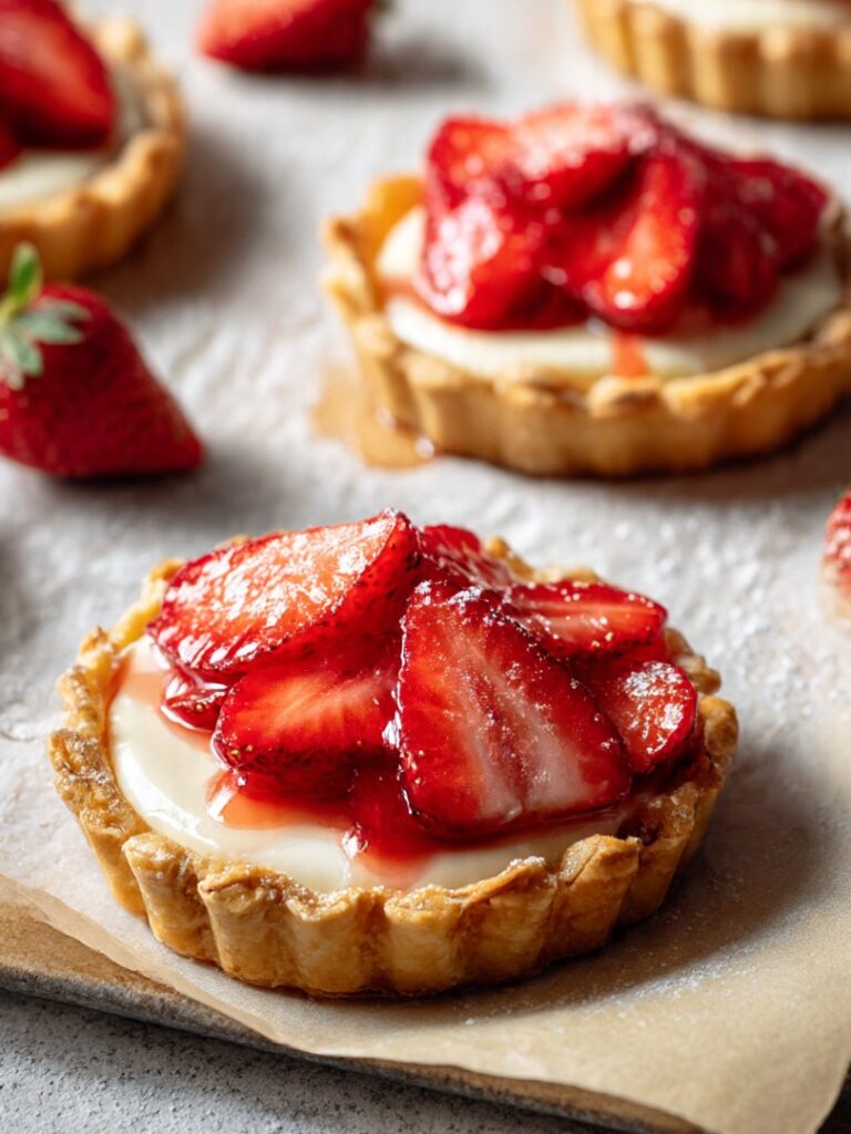 Mini cheesecake galettes met aardbei combineren een knapperige, goudbruine korst met een zachte, romige cheesecakevulling en een verse, friszoete aardbeientopping. De kleine taartjes ogen luxe en feestelijk, zoals op de foto zichtbaar is: glanzende aardbeiplakjes die mooi zijn verdeeld over een lichte roomlaag, met een subtiele glans van siroop en fijne poedersuikeraccenten. Deze traktatie is vooral populair bij koffiemomenten, verjaardagsbuffetten, high tea, lentefeesten of als afsluiter van een lichte maaltijd. Het aantrekkelijke formaat maakt ze ideaal voor individuele porties, waardoor iedereen een perfect stukje dessert krijgt zonder te delen.