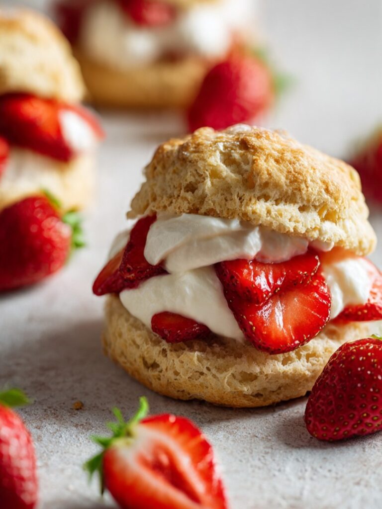 Het beeld van verse scones met aardbeien en slagroom roept onmiddellijk het gevoel van een ontspannen middag op, compleet met elegant servies en een warm kopje thee. De foto laat perfect zien hoe een ideale scone eruit hoort te zien: zacht en luchtig van binnen, licht kruimelig, goudbruin van buiten en subtiel gebarsten door de warmte van de oven. Tussen de twee helften vind je dikke, glanzende plakjes aardbei en royale klodders zachte room die uitnodigen om meteen te proeven.