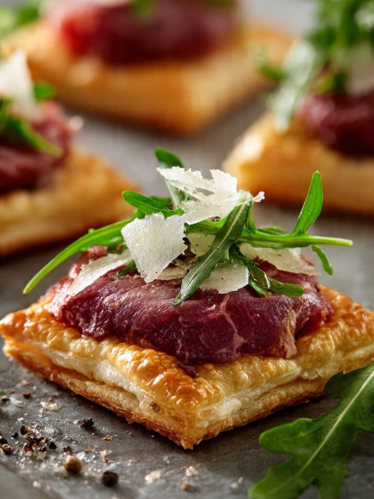 Leg op elk bladerdeegvierkantje een stuk carpaccio dat volledig aansluit op de vorm. De warmte van het bladerdeeg verzacht subtiel het vlees zonder het te garen, wat zorgt voor een boterzachte textuur.