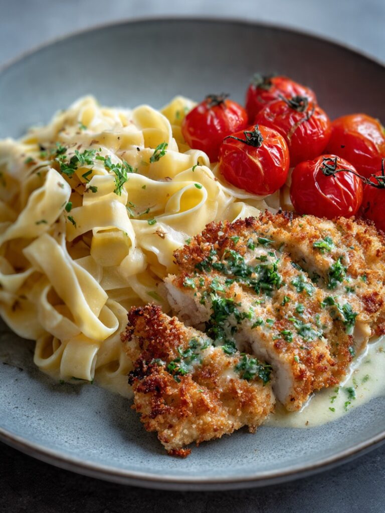 Kip Parmezaan met romige tagliatelle en geroosterde tomaatjes