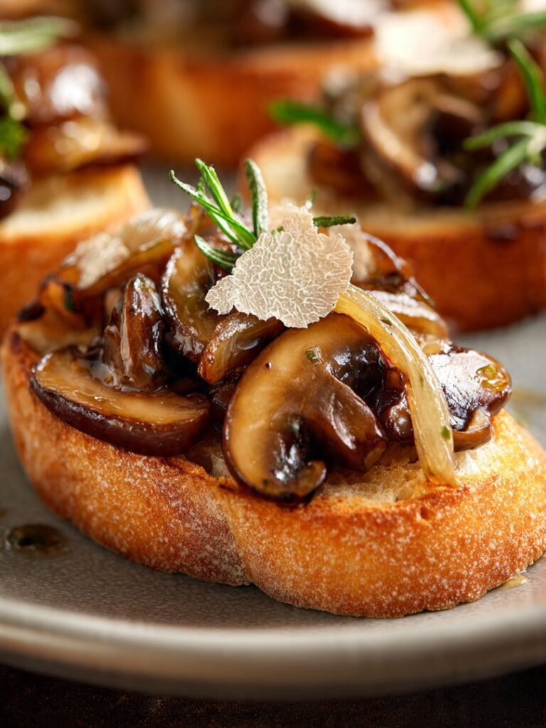 Deze bruschetta met ui, champignons en truffel is een verfijnde en stijlvolle borrelhap die Italiaanse eenvoud combineert met een vleugje luxe. Het gerecht is klein van formaat maar groots van karakter: geroosterde broodplakjes met een hartige topping van gebakken champignons, zachtgekarameliseerde ui en subtiele truffeltonen die meteen in het oog springen. De presentatie is warm en uitnodigend, precies zoals op de foto: glanzende champignons, goudkleurige broodbodem en een dunne schaaf truffel bovenop die de beleving compleet maakt. Het resultaat is een gerecht dat feestelijk genoeg is voor een diner, maar ook past bij een sfeervolle avond aan tafel met wijn en goed gezelschap.
