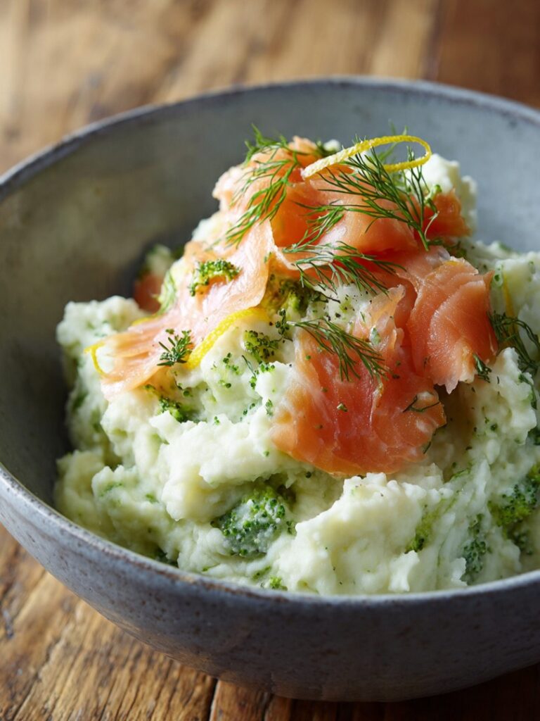 De foto laat een gerecht zien dat zowel huiselijk als verfijnd is: een luchtige puree, mooi gemengd met broccoli, afgetopt met glanzende gerookte zalm en rijkelijk bestrooid met dille. Het geheel straalt comfort food uit, maar heeft tegelijk een restaurantwaardige uitstraling.
