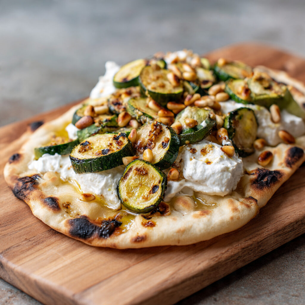 Deze naan met courgette, burrata en pijnboompitjes is een perfect voorbeeld van hoe eenvoudige ingrediënten samen een professioneel ogend en smaakvol gerecht vormen. De visuele opbouw, zoals te zien op de foto, maakt het bijzonder geschikt voor publicatie op een receptenwebsite. Een modern, elegant en toegankelijk gerecht dat zowel culinair als visueel indruk maakt.
