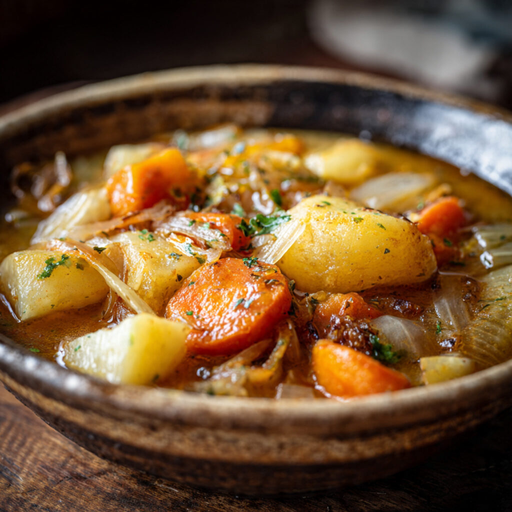 Deze vegetarische stoofschotel met wintergroenten is een klassiek, verwarmend gerecht dat perfect aansluit bij koude dagen. Op basis van de foto zien we een rijkgevulde stoof met grove stukken aardappel, wortel en ui, langzaam gegaard in een geurige bouillon. De saus is licht gebonden, glanzend en diep van kleur, wat wijst op een langzame bereiding waarbij smaken volledig de tijd krijgen om samen te komen.