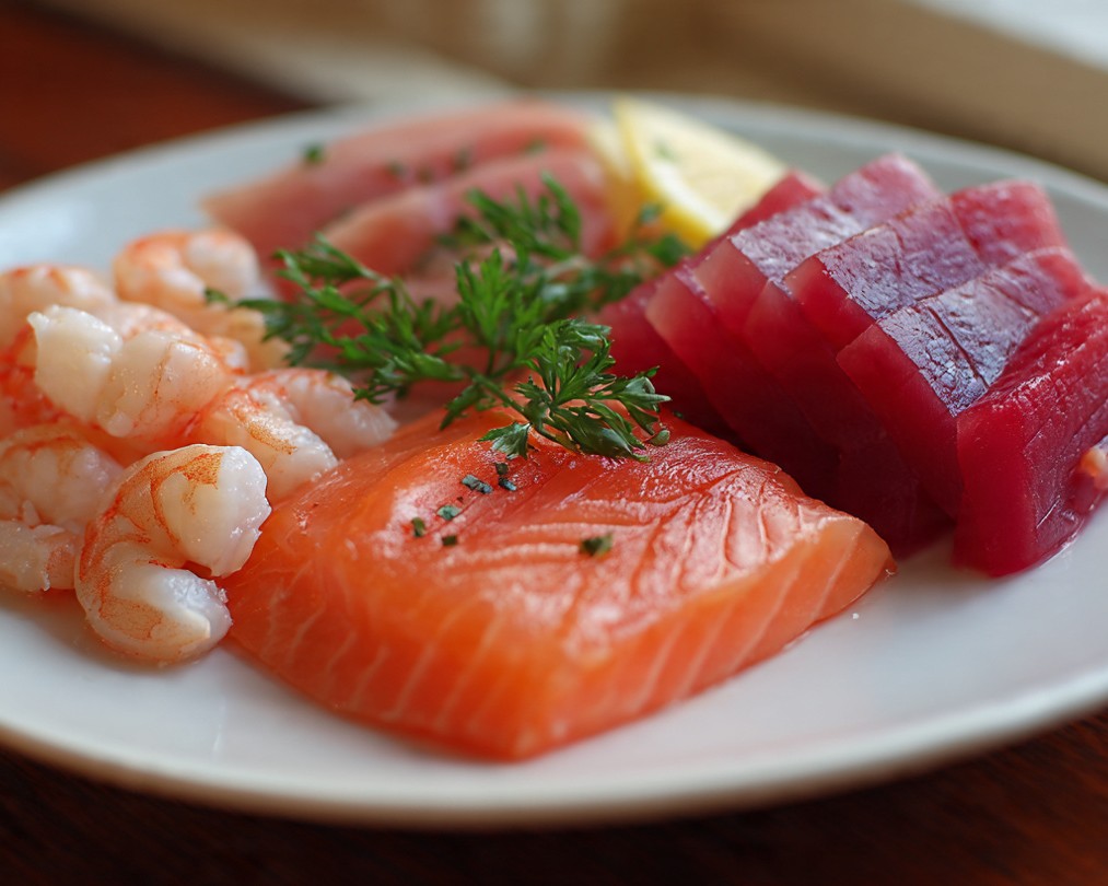 Schik de zalm, tonijn en garnalen in aparte delen op een gekoeld bord. Zorg voor een duidelijke scheiding tussen de vissoorten, zodat het trio visueel goed tot zijn recht komt. Leg een partje citroen op het bord en garneer met verse kruiden.