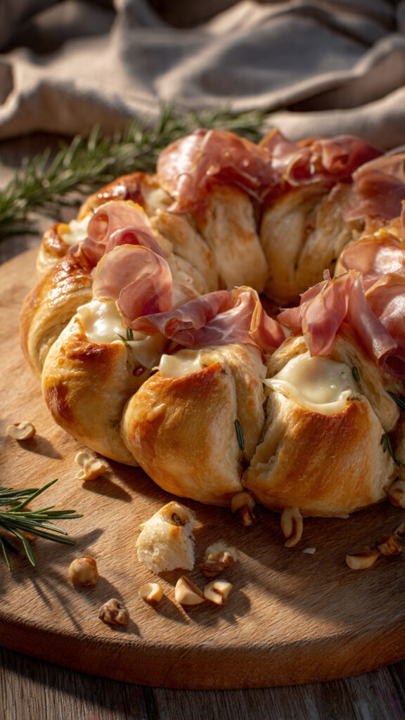 Deze borrelkrans met brie en parmaham is een indrukwekkend en stijlvol borrelgerecht dat perfect past bij feestelijke gelegenheden, zoals kerst, Oud & Nieuw of een uitgebreid weekendaperitief. Op basis van de foto zien we een goudbruin gebakken krans van zacht deeg, rijk gevuld met romige brie en afgewerkt met fluweelzachte parmaham. Het resultaat is een warm, geurend borrelbrood met een luxe uitstraling en een perfecte balans tussen knapperig, romig en hartig.
