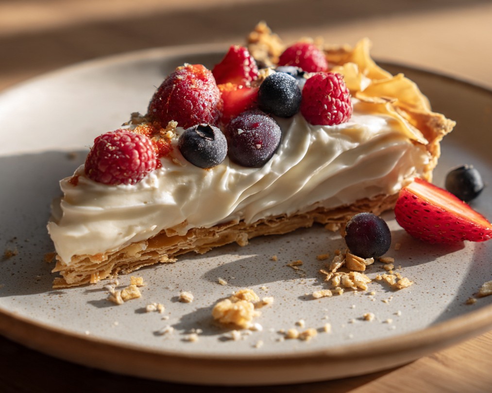 Deze filodeegtaart met mascarponetopping en zomerfruit is een elegant en licht dessert dat meteen indruk maakt. Op basis van de foto zien we dunne, knapperige lagen filodeeg, afgewisseld met een romige mascarponecrème en afgewerkt met vers zomerfruit zoals aardbeien, frambozen en blauwe bessen. De combinatie van krokant deeg, zachte crème en fris fruit zorgt voor een perfecte balans tussen texturen en smaken.