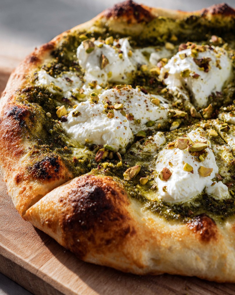 Deze pizza met pistachepesto en ricotta is een verfijnde, moderne interpretatie van een Italiaanse klassieker. Op basis van de foto zien we een rustiek gebakken pizzabodem met een luchtige, goudbruine rand, royaal besmeerd met groene pistachepesto en afgewerkt met zachte, romige toefjes ricotta en grofgehakte pistachenoten. Het resultaat is een elegante pizza waarin nootachtige diepte, romigheid en knapperigheid perfect samenkomen.