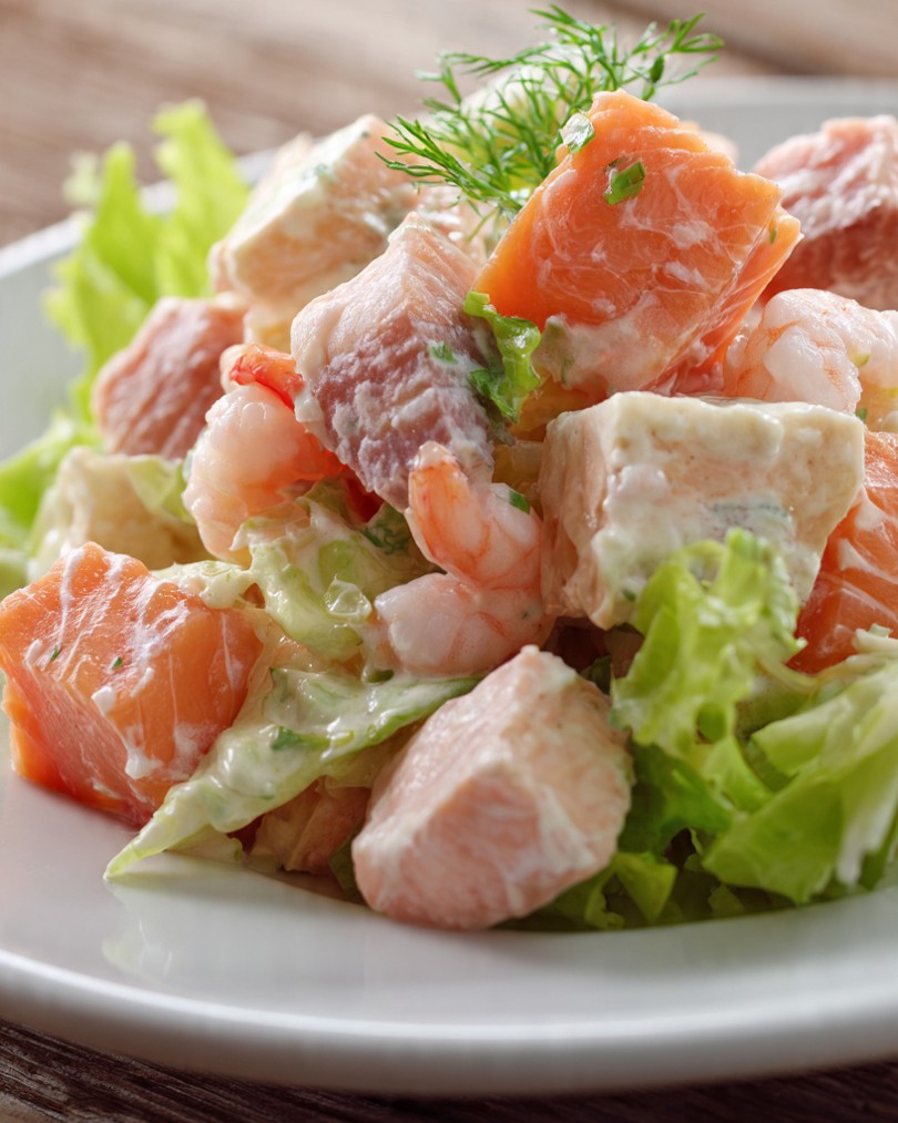 Deze vissalade met trio van vis is een verfijnd en fris gerecht dat perfect aansluit bij wat op de foto te zien is: royale blokken zalm, zachte stukjes witvis en sappige garnalen, licht omhuld door een romige dressing en geserveerd op knapperige groene sla. De presentatie is elegant maar natuurlijk, met duidelijk zichtbare visstructuren en een romige binding die alles samenbrengt zonder te overheersen.