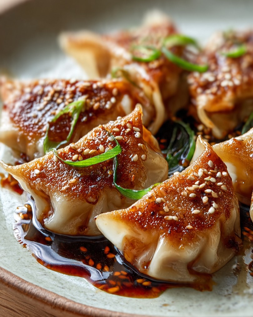 Deze gyoza in ketjapsaus zijn een echte blikvanger op tafel. Op de foto zie je goudbruin gebakken dumplings met een krokante onderkant, zacht gestoomde bovenkant en een glanzende laag ketjapsaus die zich verzamelt op het bord. Afgewerkt met sesamzaadjes en ringetjes bosui ogen ze niet alleen professioneel, ze smaken ook alsof ze uit een Japans streetfood-restaurant komen.