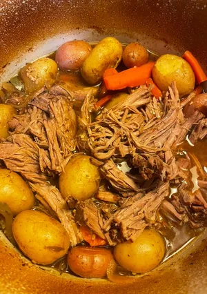 Het stoofvlees is boterzacht en valt in lange vezels uiteen, precies zoals op de foto. De aardappelen zijn zacht maar behouden hun vorm en nemen de smaak van de jus perfect op. De saus is rijk, glanzend en vol, ideaal om over het vlees en de groenten te lepelen.
