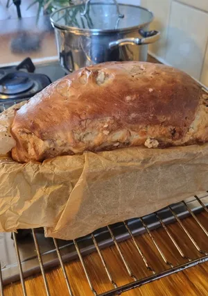 Suikerbrood is een van de meest geliefde zoete broodsoorten uit de Nederlandse baktraditie, en vooral onlosmakelijk verbonden met Friesland. Op de foto zie je een royaal, goudbruin brood met een robuuste korst en een duidelijk gerezen vorm, gebakken op bakpapier en afgekoeld op een rooster. De licht opengebroken zijkant verraadt een zachte, luchtige kruim waarin de gesmolten suiker zich tijdens het bakken heeft verspreid.