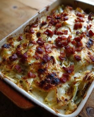 Na het bakken ontstaat een stevige, romige ovenschotel met een prachtig gegratineerde bovenlaag. De combinatie van zachte puree, sappig gehakt, licht bittere andijvie en zoute spekjes zorgt voor een perfect uitgebalanceerd gerecht, exact zoals op de foto te zien is.