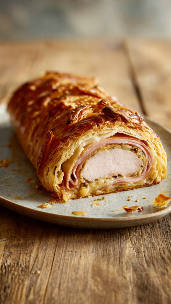 Deze bladerdeegrol met varkenshaas en Parmaham is een klassiek ovengerecht met een verfijnde uitstraling, precies zoals te zien is op de foto. De goudbruine, knapperige bladerdeegkorst omsluit een perfect gegaarde varkenshaas, omwikkeld met zoute Parmaham en een romige, kruidige vulling. Bij het aansnijden zie je duidelijke lagen: krokant deeg, ham, mals vlees en een zachte kern.