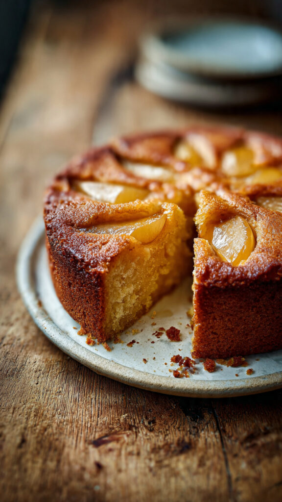 Deze peren-mandarijncake is een elegante, huiselijke cake waarin zachte peer en frisse mandarijn perfect samenkomen. Op de foto zie je precies waar dit recept om draait: een goudbruine cake met een licht krokante rand, een sappige kruim en prachtig ingelegde stukjes peer die tijdens het bakken langzaam in het beslag zijn gezakt.