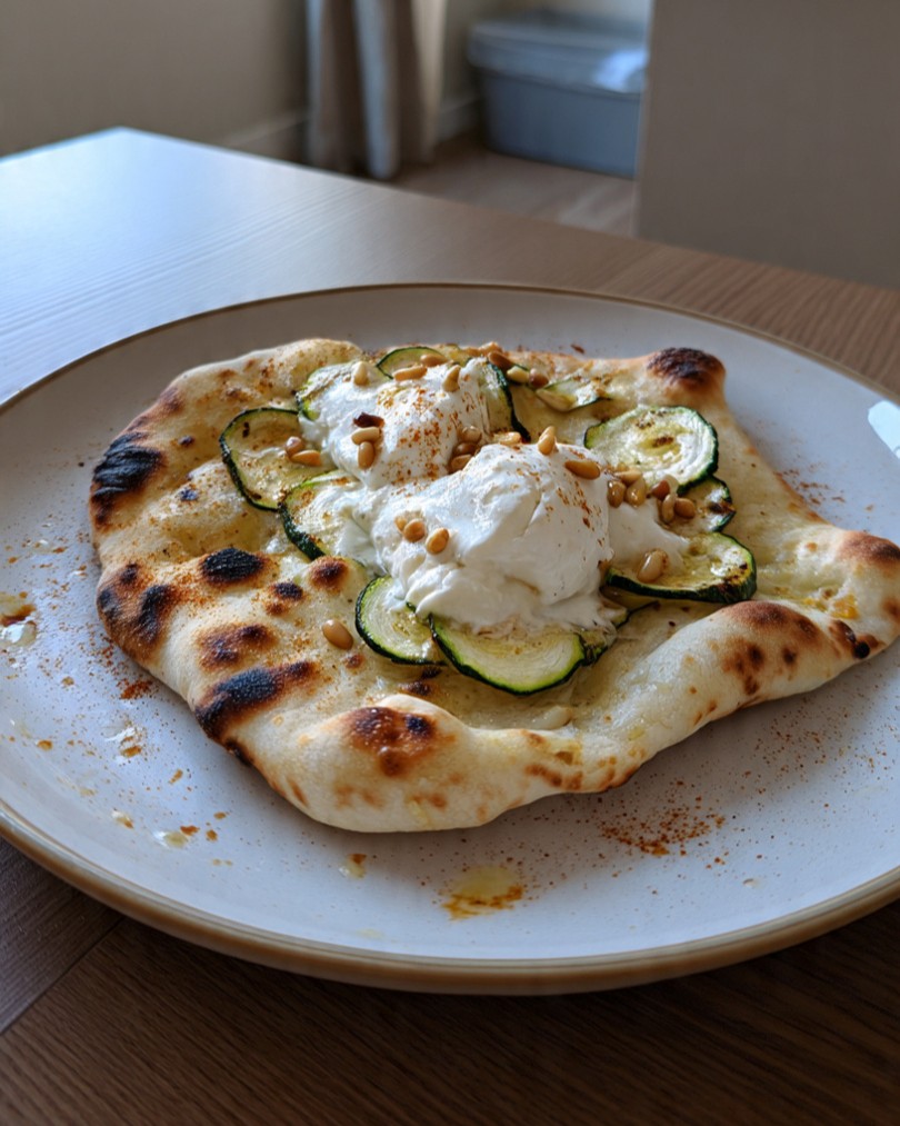 Het eindresultaat is een prachtig gebalanceerd gerecht: licht knapperig naanbrood, zacht gebakken courgette, volle romige burrata en een subtiele nootachtige bite van pijnboompitten. De natuurlijke kleuren en texturen zorgen voor een rustieke, maar verfijnde uitstraling die perfect aansluit bij de foto.