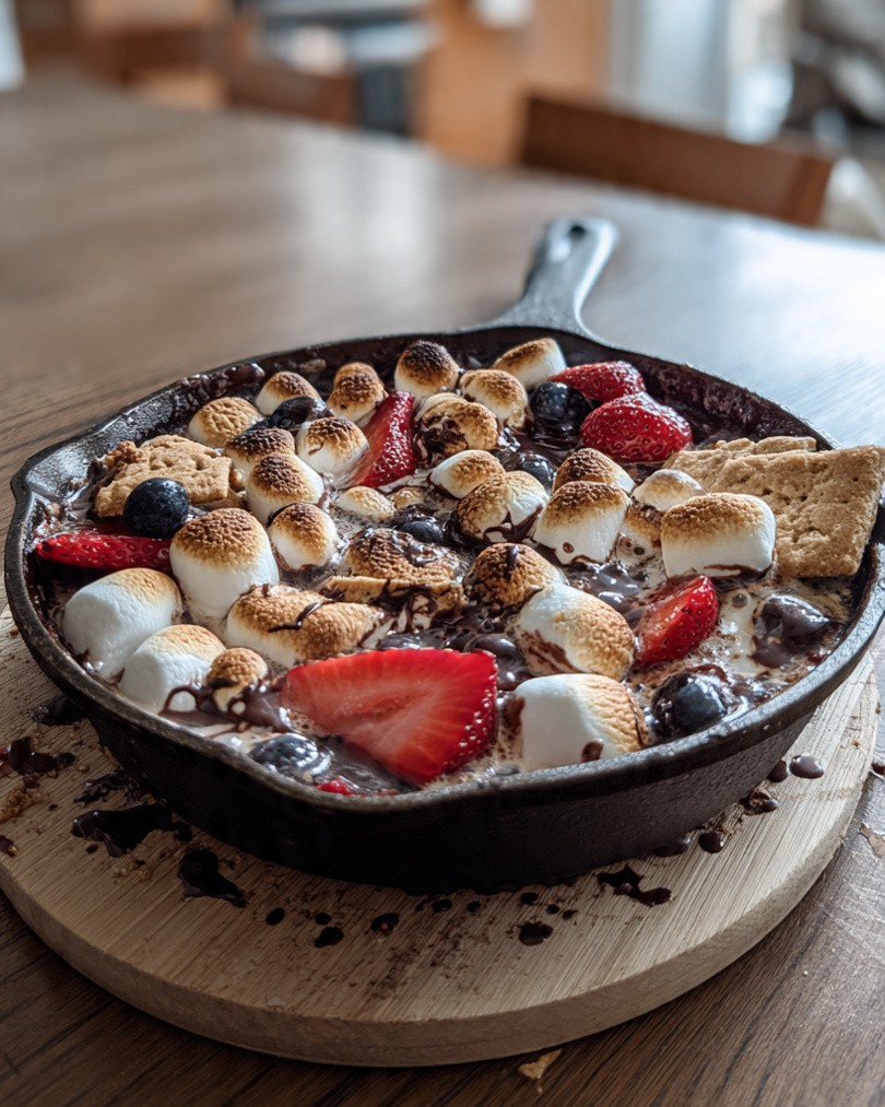 Deze s’mores-pannetjes met fruit zijn pure verwennerij, precies zoals te zien is op de foto: een gietijzeren pannetje gevuld met gesmolten chocolade, goudbruin geroosterde marshmallows en fris, sappig fruit. Het contrast tussen warm en koud, zacht en knapperig, zoet en licht zuur maakt dit dessert bijzonder aantrekkelijk.