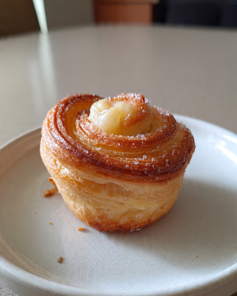 De cruffins zijn aan de buitenkant knapperig en gelaagd, met een duidelijk zichtbare spiraalstructuur. Binnenin zorgt de zachte banketbakkersroom voor contrast en smeuïgheid. De sinaasappel geeft een frisse toets zonder de romige smaak te overheersen. Het eindresultaat oogt ambachtelijk, luxe en perfect in balans.