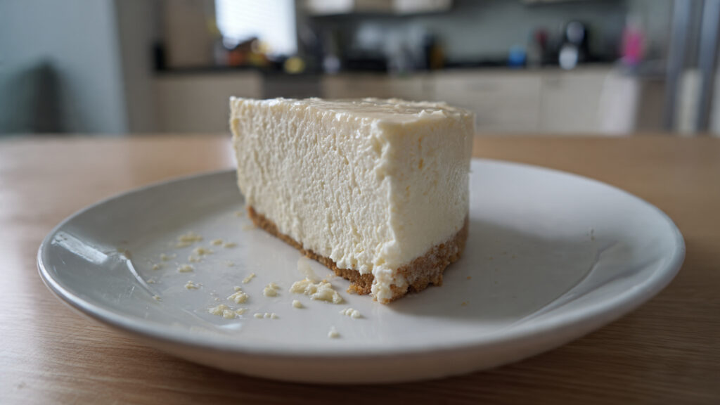 Deze romige cheesecake is een klassieker die indruk maakt door zijn eenvoud en verfijnde structuur. Op de foto zie je een strak gesneden punt met een gladde, bijna fluweelachtige vulling en een dunne, gelijkmatige koekbodem. De cheesecake oogt compact maar licht, met een romige textuur die mooi rechtop blijft staan en toch zacht smelt in de mond.