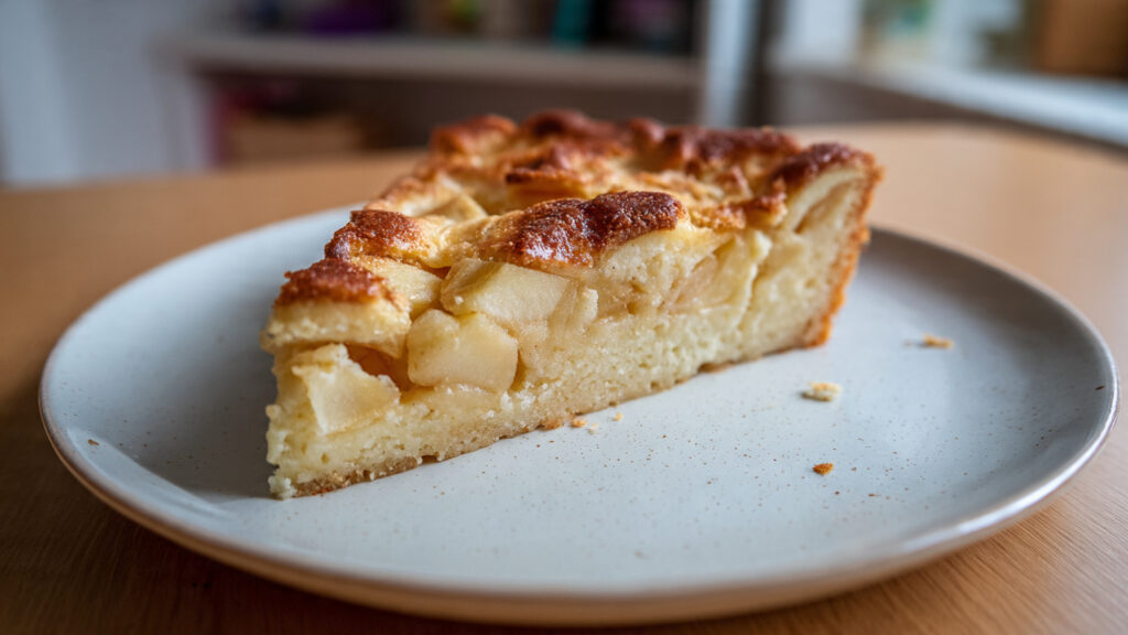 De appeltaart is zacht, licht en smeuïg, met sappige appelstukjes die voor een natuurlijke zoetheid zorgen. De bovenkant is licht krokant en goudbruin gebakken, terwijl de binnenkant mooi vochtig blijft. Precies zoals te zien is op de afbeelding: eenvoudig, huiselijk en uitnodigend.