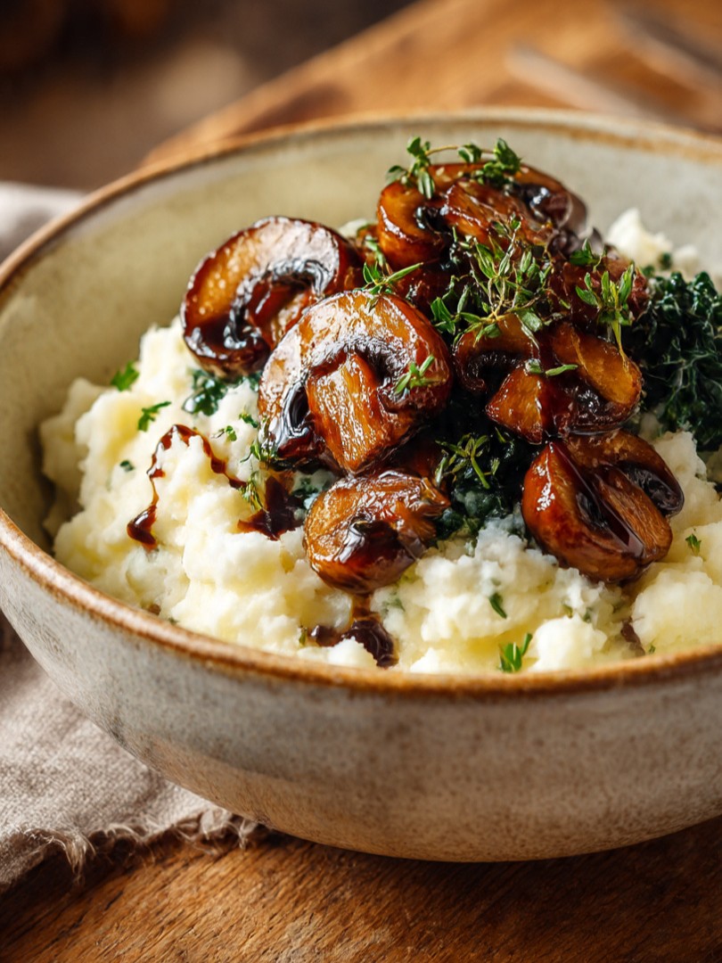 Boerenkoolstamppot met geroosterde champignons en balsamico