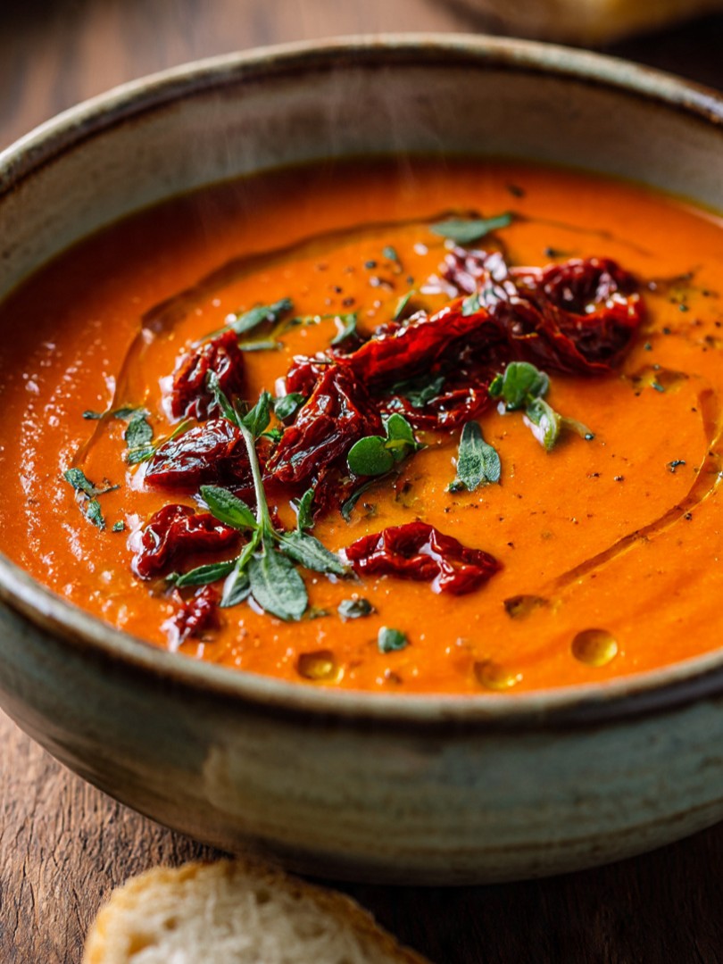 Geroosterde paprikasoep met zongedroogde tomaatjes
