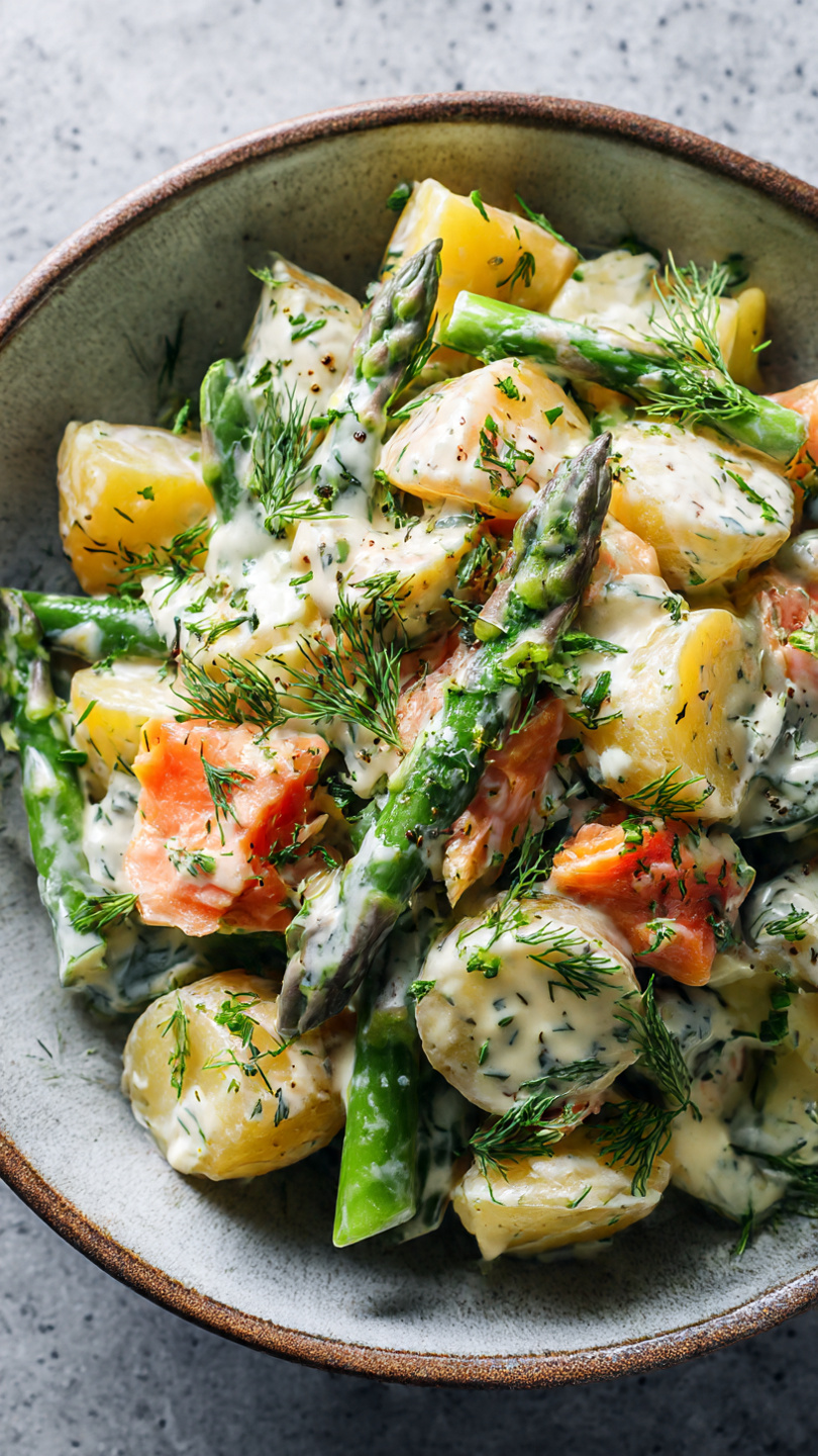 Aardappelsalade met asperge, warmgerookte zalm en dilledressing