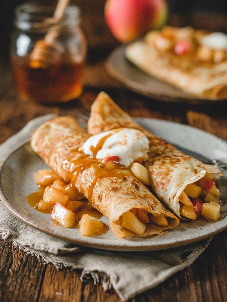 Pannenkoeken met karamelappeltjes en honingslagroom